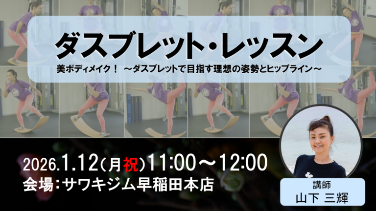 SAWAKI GYM が提唱する「動ける身体作り」のメソッドを基に、最新のトレーニングツール「ダスブレット」を使用した特別レッスンを開催します。このレッスンでは、姿勢改善とヒップアップを中心に、日常生活で役立つ機能的な身体作りを目指します。「動ける身体作り」とは、見た目だけでなく、しなやかで強く、バランスの取れた身体を作ることを目的としたプログラムです。このメソッドとダスブレットの特性を組み合わせることで、普段使わない筋肉を効率よく刺激し、理想のボディラインを手に入れることが可能です。初心者から経験者まで、すべての方に楽しんでいただける内容となっていますので、この機会にぜひご参加ください!