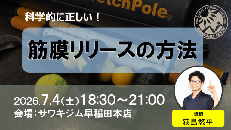 サワキジムアカデミーでは、理学療法士・荻島悠平先生による「科学的に正しい筋膜リリースの方法」セミナーを開催いたします。マッサージガンやフォームローラー、テニスボール、100均グッズなど多様なツールを用い、エビデンスに基づいたリリース法と最新の筋膜理論を体系的に学ぶことができます。