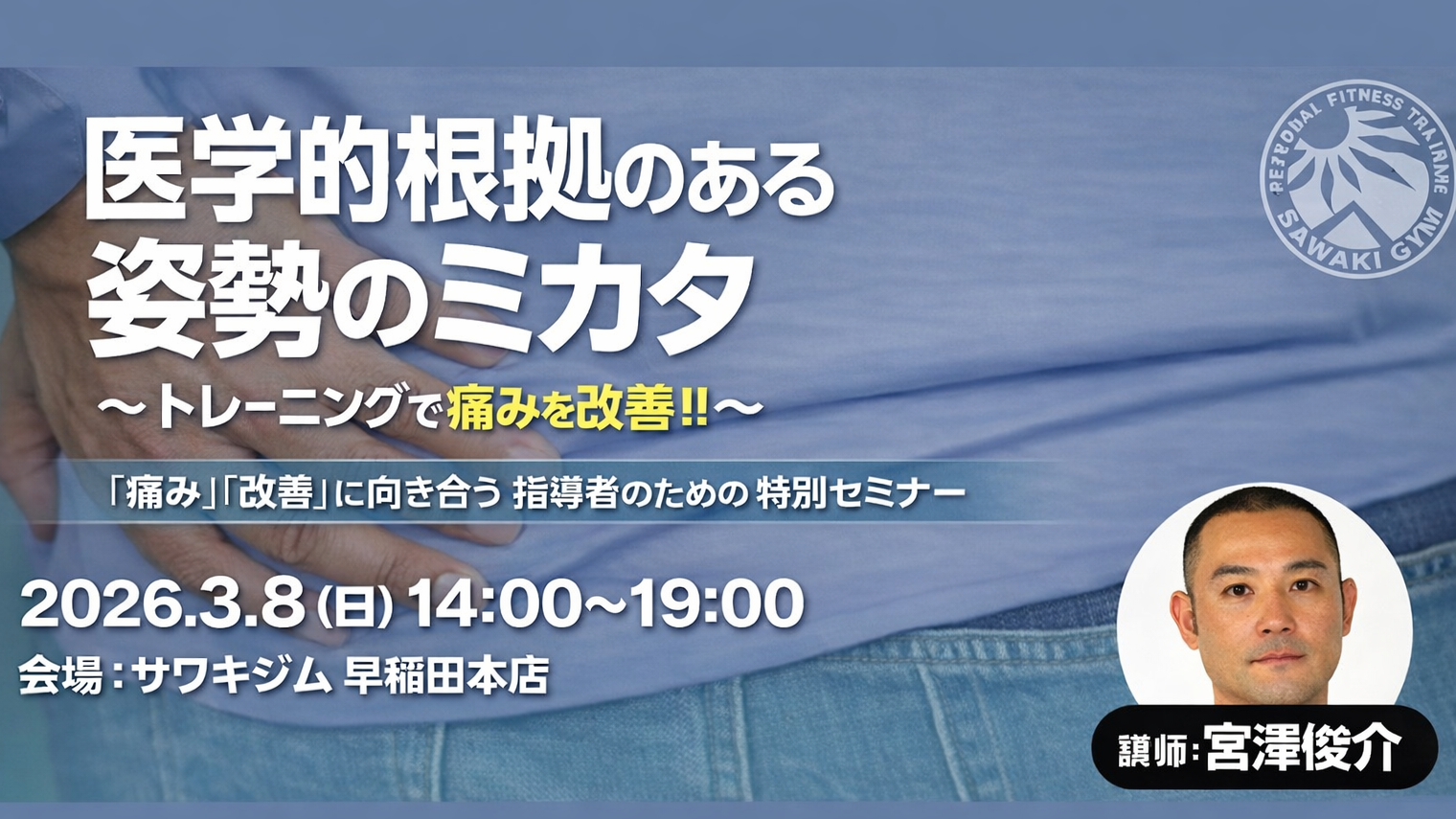 「姿勢が悪いから痛みが出る」「反り腰だから腰痛になる」…本当にそうでしょうか? 世の中には“姿勢改善”をうたう情報が溢れています。しかしその多くは、見た目の姿勢評価だけで語られ、医学的な裏付けが曖昧なものも少なくありません。 本セミナーでは、サワキジムアドバイザー/理学療法士の宮澤俊介氏を講師に迎え、「姿勢をどう見るべきか」「痛みとどう結びつくのか」「ではトレーニングで何をすべきか」を、エビデンス […]