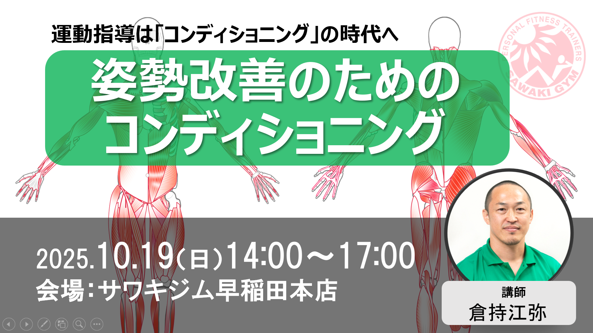 ファンクショナルトレーニングは、筋肉の増強だけでなく、動作の質の向上に焦点を当てたトレーニングです。これにより、日常生活やスポーツで必要な動作を効率的に行う土台を築くことができます。このコースでは、基礎理論からトレーニングの実践、プログラムの作成までを学習し、ファンクショナルトレーニングの基礎を1日で習得することを目指します。 ◆日程:2025年2月11日(火)10:00~17:00◆会場:サワキ […]